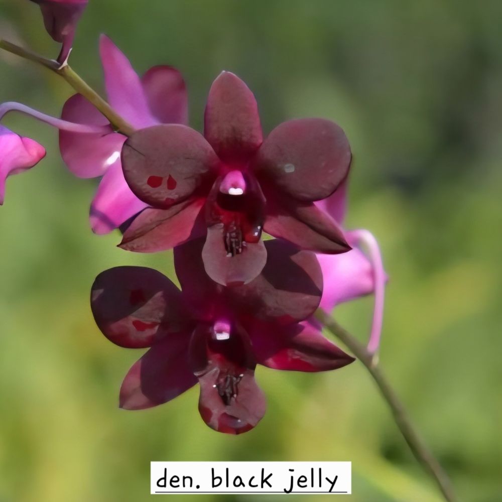 Dendrobium Black Jelly is a modern Dendrobium hybrid known for its extremely dark, glossy flowers that range from deep burgundy to near‑black. It’s one of the darkest commercial Dendrobium lines available and performs exceptionally well in warm, humid climates Deep black‑purple to inky burgundy blooms, often appearing almost black in low light.