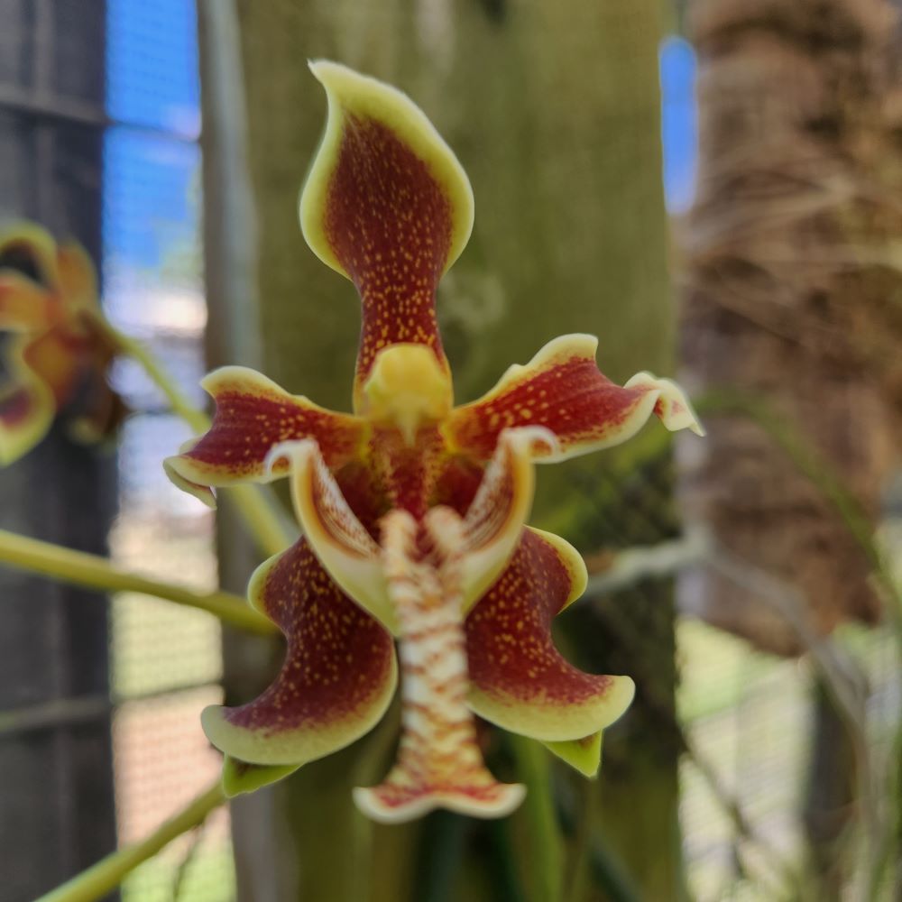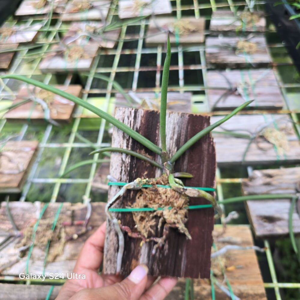 Paraphalaenopsis labukensis sp. is native to Borneo and requires warm temperatures, good air circulation, and high humidity. Does not like extreme climates. Beautiful terete (pencil-shaped) leaves, blooms emerge from the base of the plant, in clusters that usually carry a strong spicy scent. The blooming season is usually spring or early summer. The flowers normally stay on the plant for 2 to 3 weeks. They are closely related to Phalaenopsis and other vandaceous orchids and cross hybridizing can be done, to some extent.