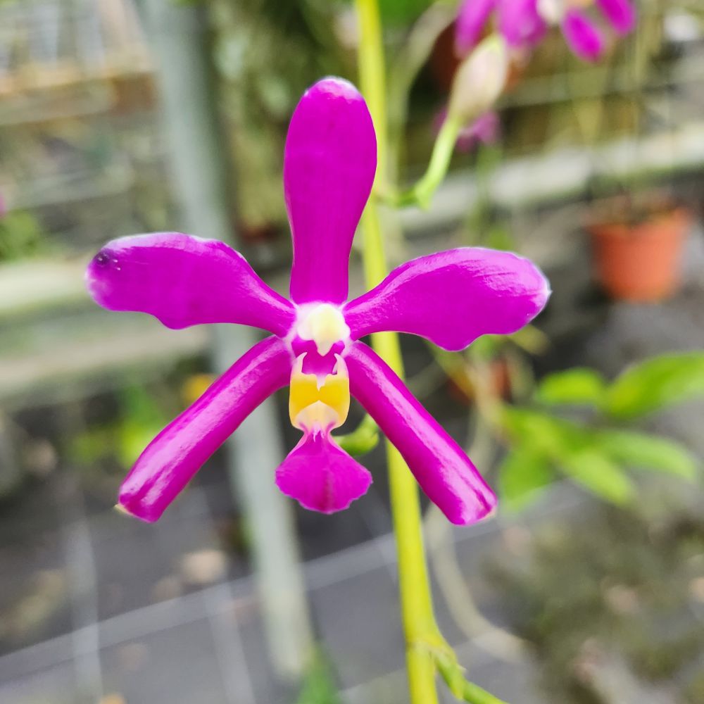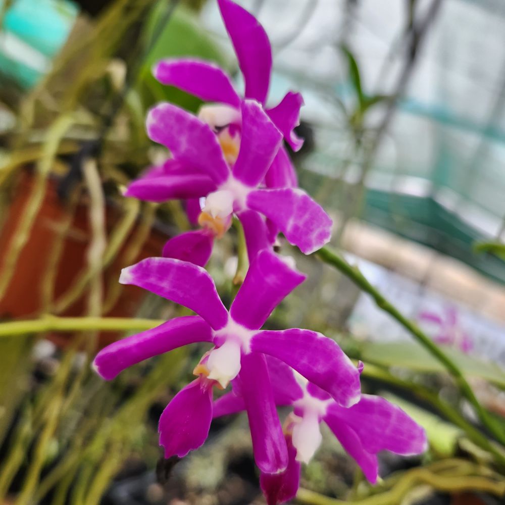 the flowers are fleshy glossy, dark magenta colour with yellow spot on the lateral lobes of the labellum, long lasting. can lasts up to 4 weeks.