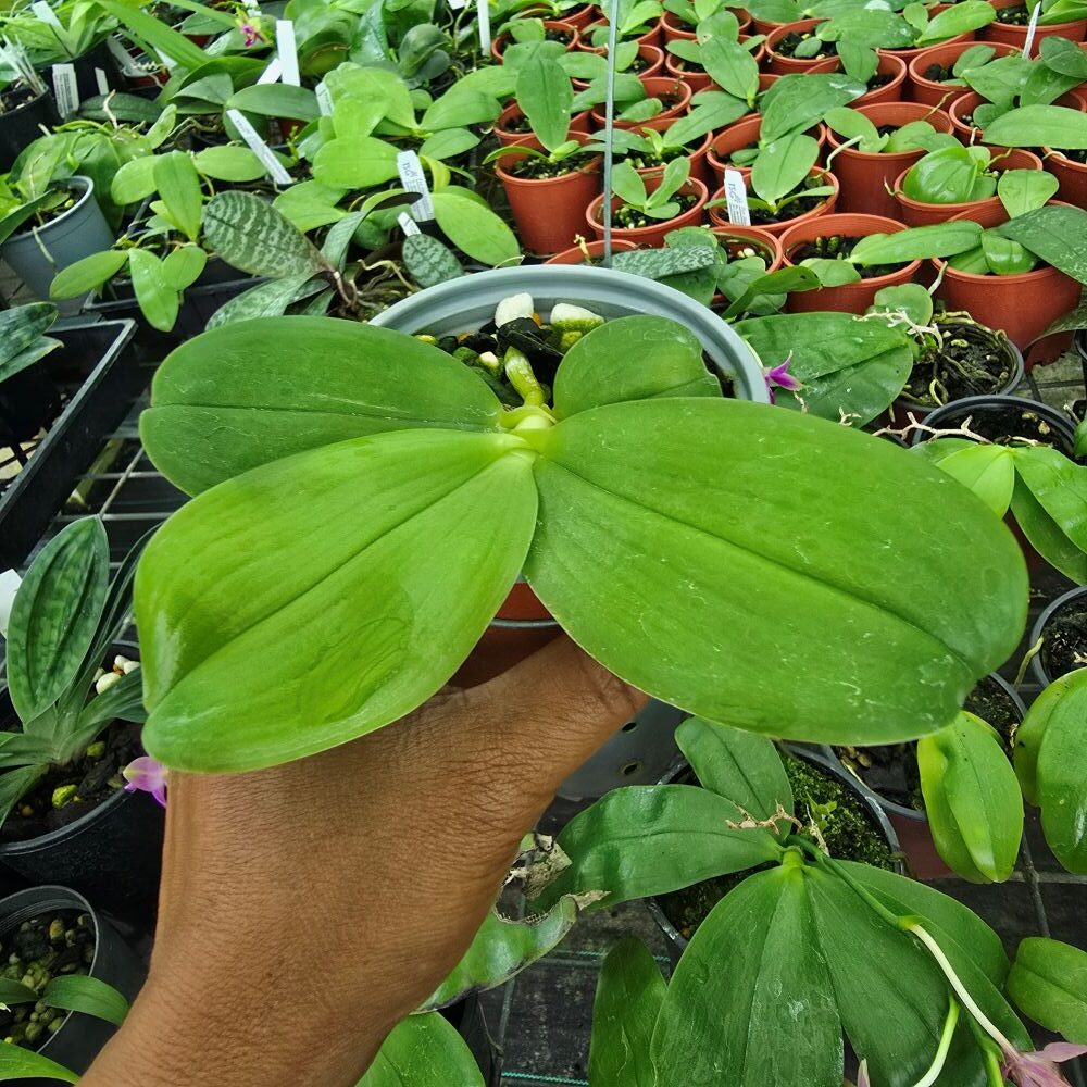 Naturally pendulous, with a very short stem and broad, leathery leaves.